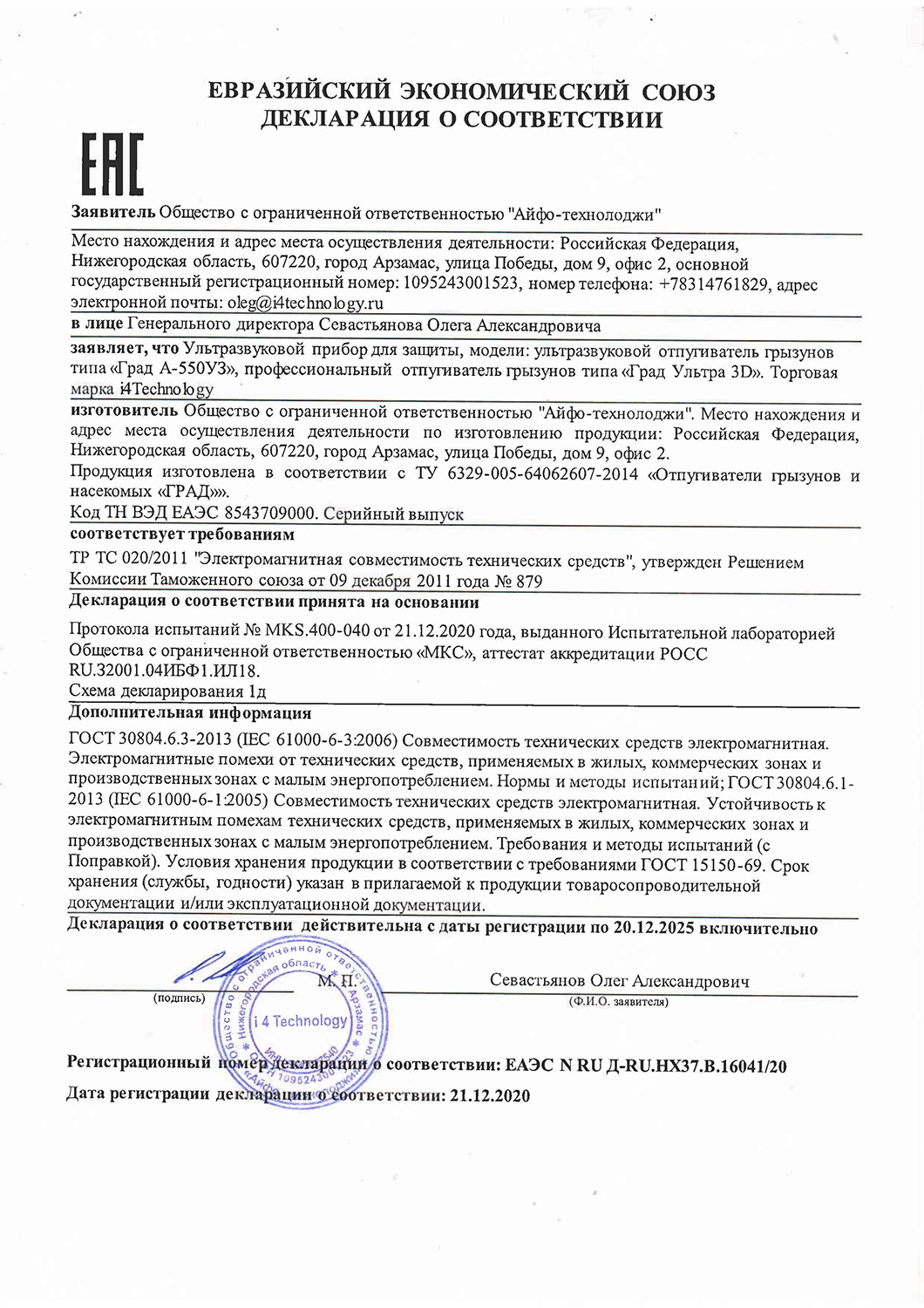 Приобрести профессиональный ультразвуковой отпугиватель мышей и крыс "ГРАД УЛЬТРА 3Д" по выгодной цене в Ирбите очень просто: для этого достаточно оставить заявку нашим операторам в онлайн-чате или по email.